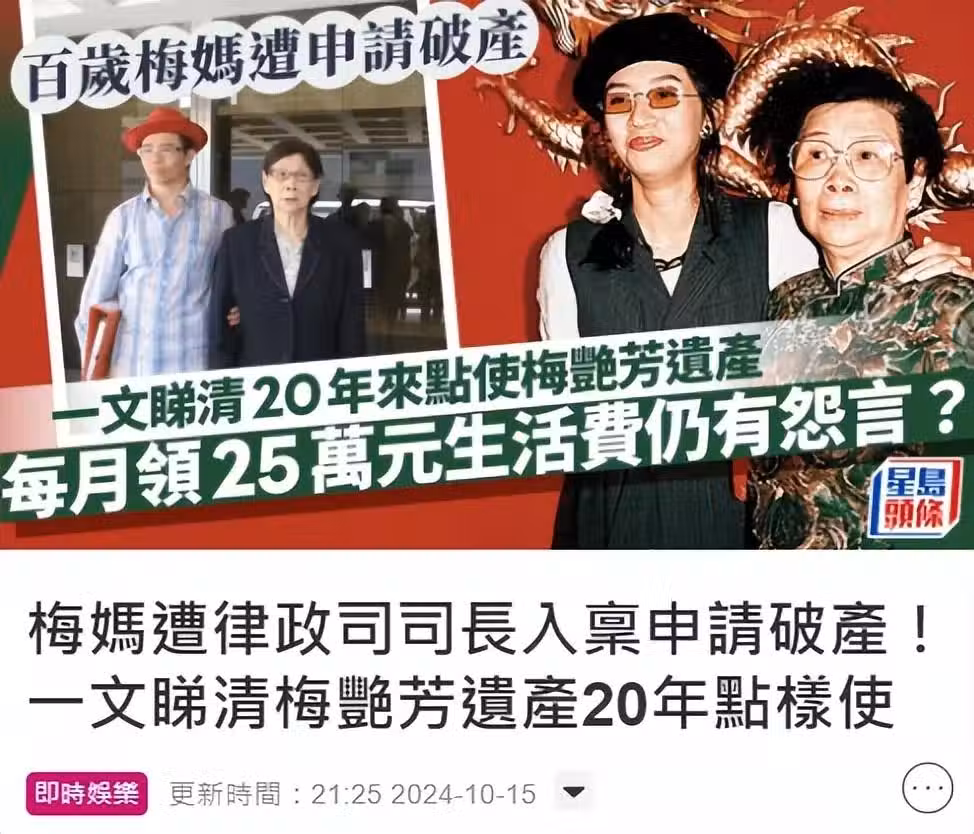梅媽過去為了爭奪遺產和兒子多次大鬧法院,屢戰屢敗拖欠百萬訴訟費,2012年曾被申請破產。