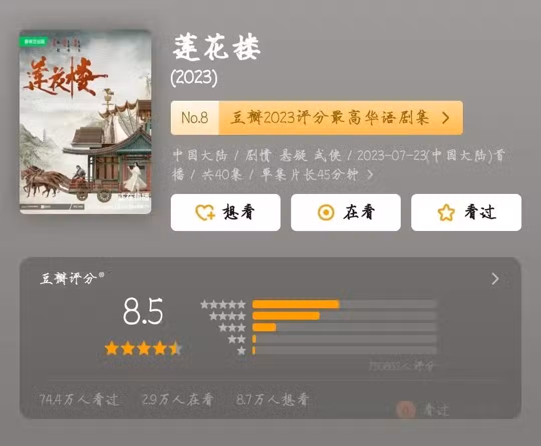 全網應該超過100萬觀眾觀看,並打下了8.5的高分,位列2023最佳劇作榜單第8名。