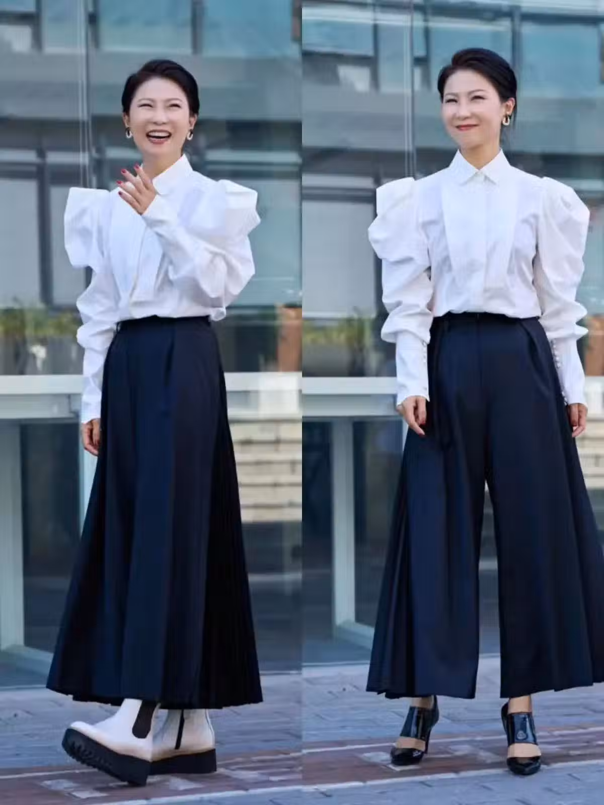譬如博主邢文所穿的白色襯衫,俏皮優雅又可以提升氣場,或者選擇白色針織衫、白色外套。