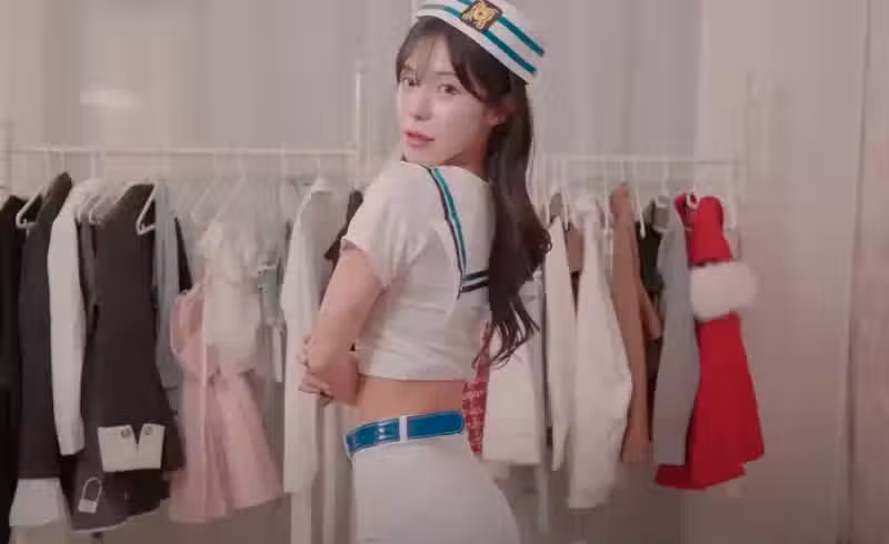 ▲李多慧花1.9萬台幣在淘寶下單,最後收到50個包裹,她一一開箱試穿,其中一套水手服辣翻,李多慧小蠻腰全被看光。(圖/이다혜 李多慧YouTube)