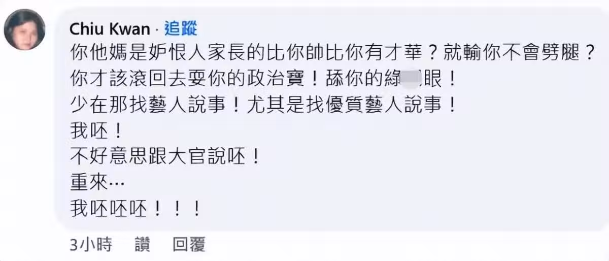 台灣知名製片人邱黎寬在王定宇的社交帳號下怒懟,讓他滾回去,別找劉德華說事。