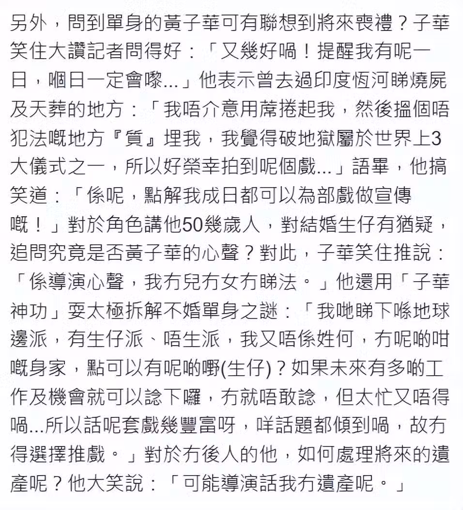 不過,黃子華沒有把話說死,他說如果未來有很多工作機會就會考慮,沒有的話就不敢想,但太忙了又不行,現在這部戲很豐富,什麼話題都談到,所以沒辦法推掉。