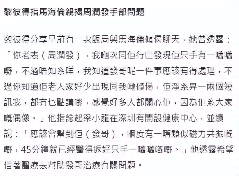 黎彼得表示很多人都在關心發哥,藝人馬海倫有一次跟他聊天,說到周潤發手臂上的小肉球不知道是什麼,對此表示擔憂,她曾慰問了發哥,但發哥回復簡訊不談此事,現在很多人都在關心發哥,因為發哥是大家的偶像。
