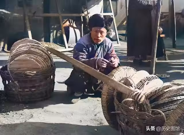民國時期,在一個集市上,一名男子正在售賣蓋簾。他挑的擔子兩頭,裝著各式各樣的蓋簾,都是用高粱杆製作而成的。蓋簾、又叫蓋墊,餃子簾,餃子拍,餃子盤,篦簾,蓋件。用於放各種麵食,還可當鍋蓋用。