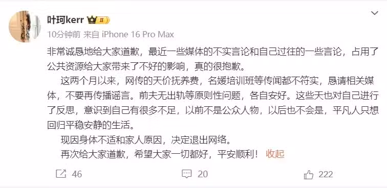 這些天也對自己進行了反思,意識到自己有很多不足,以前不是公眾人物,以後也不會是,平凡人只想回歸平穩安靜的生活。 現因身體不適和家人原因,決定退出網絡。 再次給大家道歉,希望大家一切都好,平安順利!