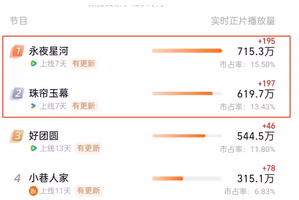 本以為這兩部戲會來個你追我趕,相互追逐,結果卻是:《永夜星河》一騎絕塵,長期霸榜收視率榜首的位置,《珠簾玉幕》只能屈居於第二的位置。