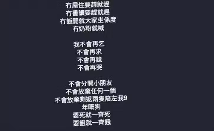 雯雯又提到四個兒子,感到萬念俱灰:「沒有房子住要趕就趕,沒有書讀要趕就趕,沒有飯開就大家坐在那,沒有奶粉就哭。我不會再乞,不會再求,不會再想,不會再哭,不會分開小朋友,不會放棄任何一個,不會放棄剩下兩隻陪了我9年的狗,要死就一起死,要餓就一起餓。」