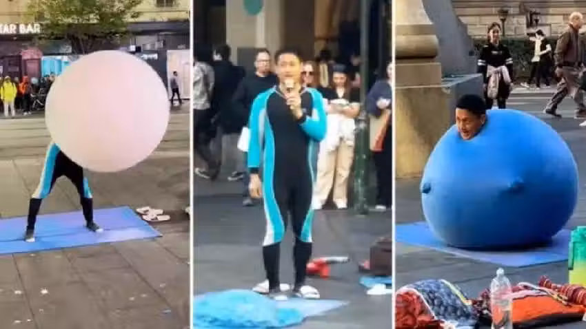 據外媒《9news》報導,他的表演形式是會先在地上鋪好一張瑜珈墊,並將全身塞入一顆充滿彈性的巨大氣球中,隨即將音樂打開,隨著節奏上下、左右彈動,圖/翻攝自9news