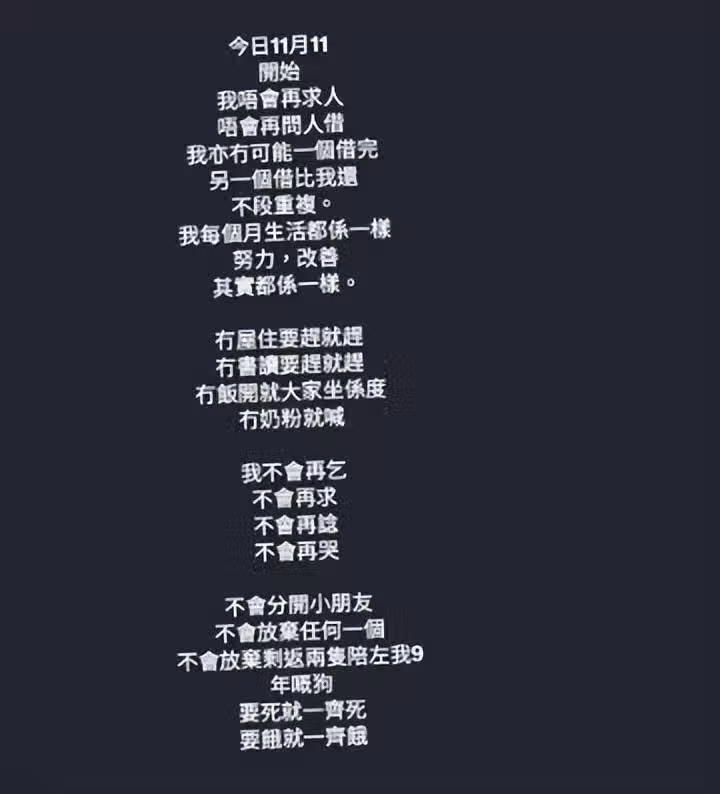 張致恆日前踏入40歲,雯雯就在限時動態中直言感到萬念俱灰:「沒有屋住要趕就趕,沒有書讀要趕就趕,沒有飯開就大家坐在那,沒有奶粉就哭。我不會再乞,不會再求,不會再想,不會再哭,不會分開小朋友,不會放棄任何一個,不會放棄剩下兩隻陪了我9年的狗,要死就一起死,要餓就一起餓。」