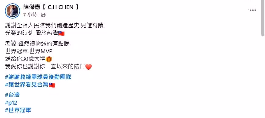 奪冠後首發文!台灣隊長陳傑憲「狂掃4大獎」 甜蜜「送愛妻兩大禮」:我愛你❤️