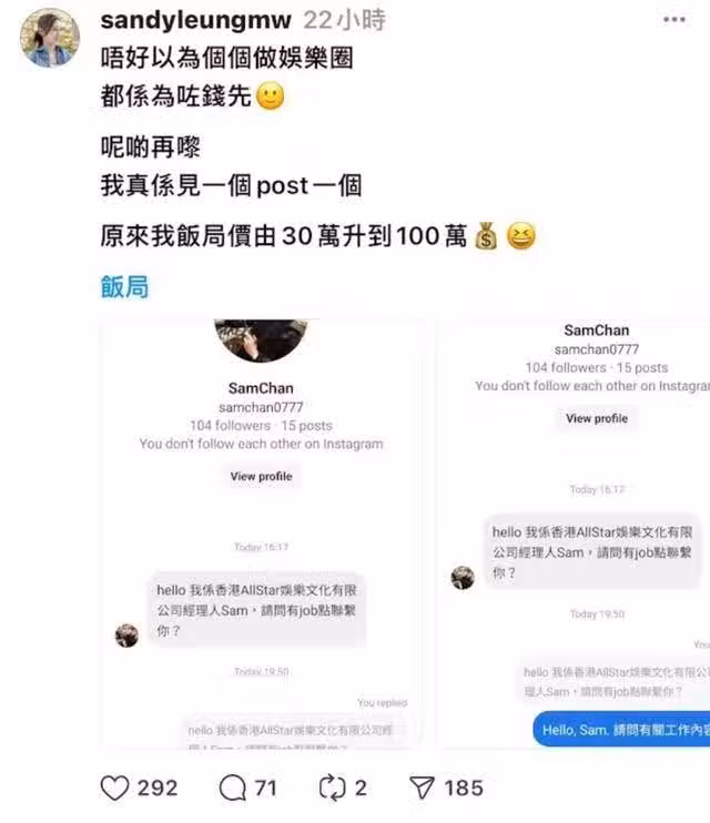 從之前二人曬出的對話截圖中,可以看到對方的社交平台帳號的頭像都是一樣的,並且問的問題也都是一樣的,看來對方是在到處向女藝人們「問價」。在過往,相信大家也是不時會看到這類的報道,就連視後蔡思貝,她也曾在節目中公開有人開價200萬邀請她出席飯局。