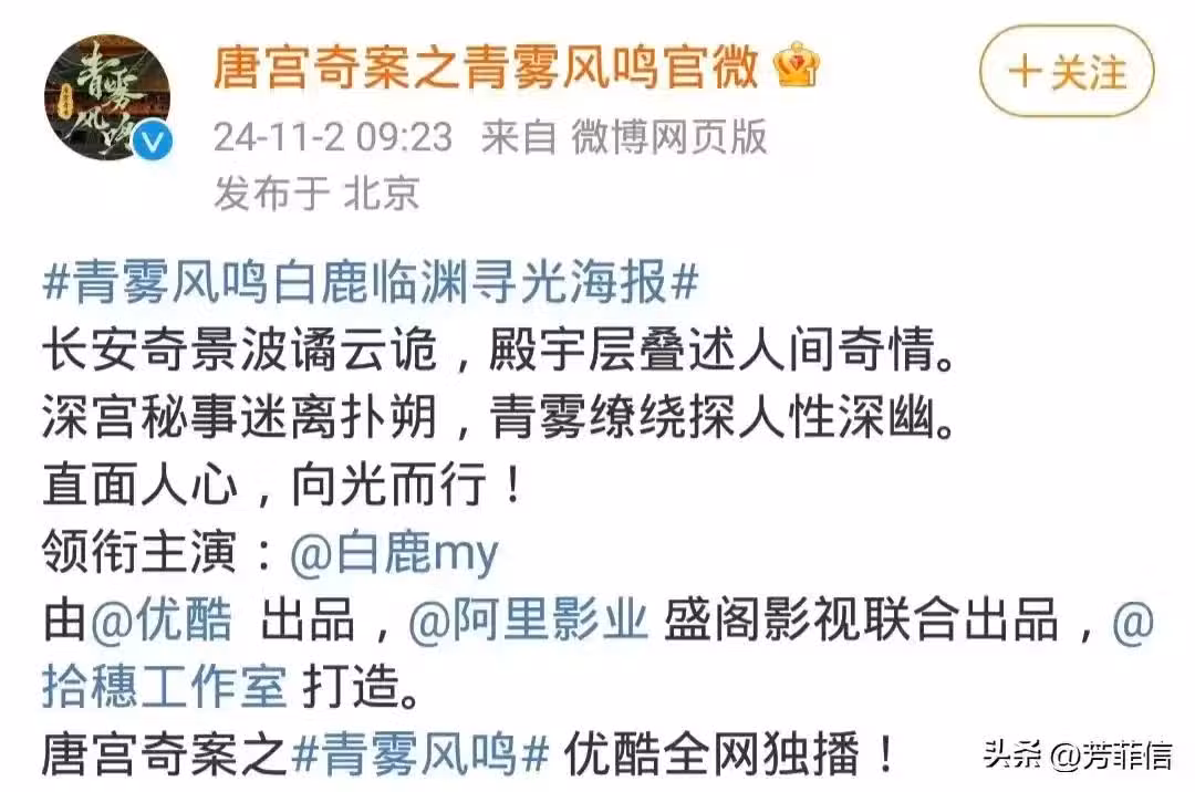 至此,這部由白鹿王星越領銜主演的《唐宮奇案之青霧風鳴》便正式確定了男女主。
