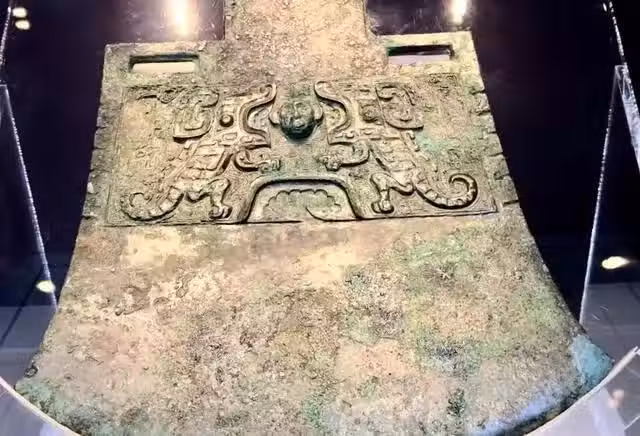 這是婦好的銅鉞,有9公斤重,一共出土了四件。鉞在商朝象徵著王權和軍事權力,能掌生殺大權。透過銹跡斑斑的銅鉞我們似乎能感覺到這位女將軍的殺伐果斷。