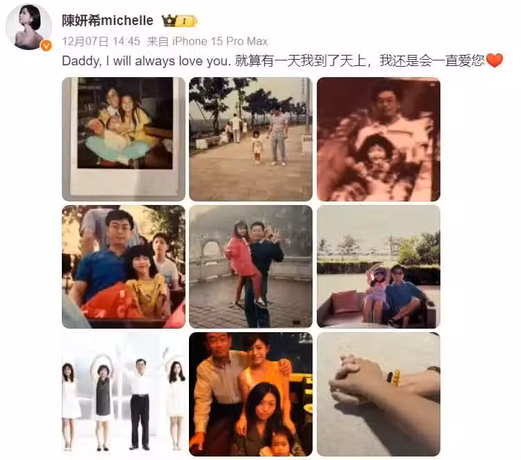 陳妍希悲痛發文:「爸爸,我會永遠愛你,就算有一天我到了天上,我還是會一直愛你」,陳妍希還曬出多張全家福合影,全都是她對父親的愛與思念,能感受到陳妍希父女的感情非常深厚,爸爸離開了,陳妍希萬分不舍。