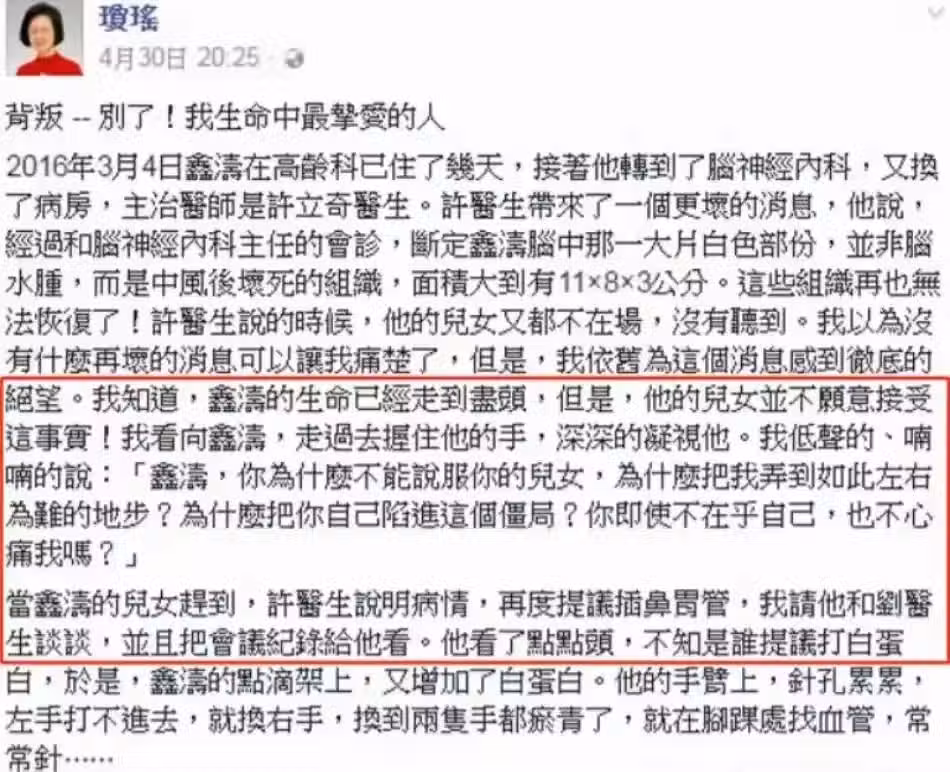 在2016年,平鑫濤中風住院時他的腦中已有壞死組織,但他的兒女不願接受,在關於插鼻胃管治療問題上雙方也有分歧,瓊瑤當時已經處於左右為難的地步,她當時在自語「為什麼不能說服你的兒女,為什麼要陷入這個僵局,即使不在乎自己,也不心痛我嗎?」