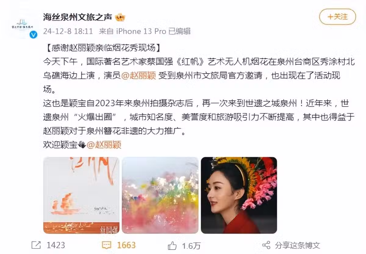 在穎寶發布動態之前,泉州文旅官方帳號就曾發文感謝了穎寶。原來在2023年的時候,穎寶曾前往泉州拍攝了一組簪花寫真大片,由此帶火了泉州簪花非遺文化。此番官博特地發文致謝穎寶,並且還邀請她現身觀看了這場盛大且夢幻的煙花秀。而穎寶帶著兒子一同體驗了一次非遺文化,也算是言傳身教了。