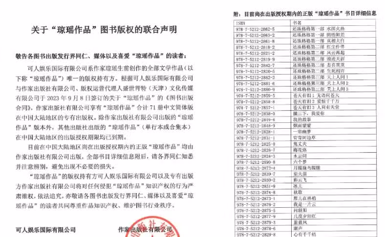 聲明中說道:可人娛樂是瓊瑤生前創作的全部文學作品唯一的版權持有方,除了旗下公司作家出版社所出版的瓊瑤作品以外,其他出版社的瓊瑤作品版權皆已到期。