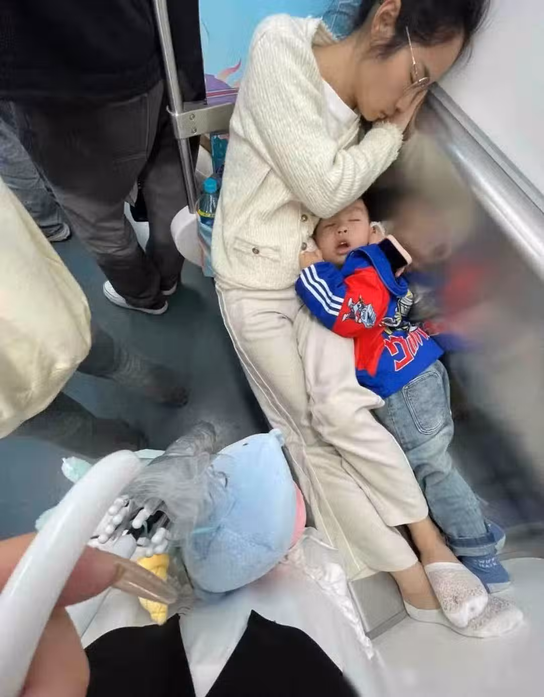 從照片中可以看到,捷運座位上,一名穿著白色針織外套的媽媽斜靠在座椅邊緣,雙手護著懷中熟睡的孩子。孩子穿著藍色外套和牛仔褲,蜷縮在媽媽懷裡,睡得香甜。地上還放著玩偶和幾個散落的物品,看起來似乎是剛經歷了一段繁忙的行程。