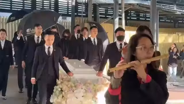 稍早一點,瓊瑤的棺木在眾人的護送下現身,見的白色的棺木緩緩行進,前方則有兩個殯葬人員負責吹笛子,想來是她作品中的曲目。