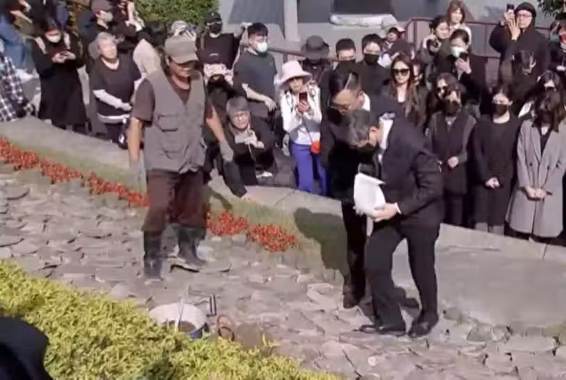 到達陽明山後,很多粉絲已經等在了那裡,大家表情悲痛的祭拜完後,瓊瑤兒子雙手托著母親的骨灰,蹲跪在地上開始完成最後的拋灑。