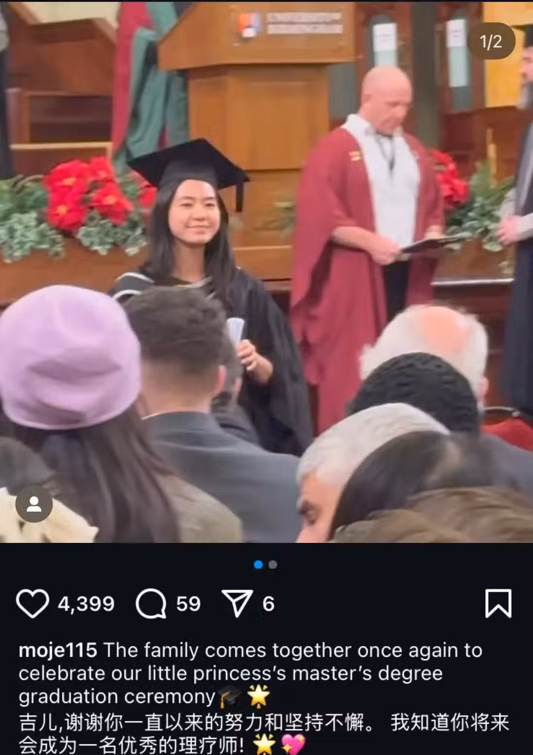 毛舜筠在社交平台上曬出了出席小女兒碩士畢業典禮的視頻與照片。視頻中毛舜筠與家人坐在觀禮席上,看著小女兒帶著四方帽,穿著畢業袍在畢業典禮上接過畢業證書的過程。區亦山長得很漂亮,戴上了四方帽的她顯得神采飛揚,拿著畢業證書望向觀禮席上的家人展露出了燦爛的笑容。毛舜筠在台下見證了這一過程,顯得頗為激動,所以第一時間分享了出來。毛舜筠留言,感謝女兒一直努力和堅持不懈,並稱女兒將來一定會成為一名優秀的理療師。