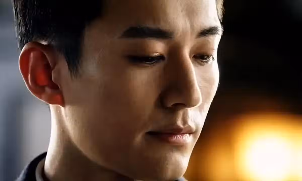那是一個年輕的男子,他的衣服已經被雨水淋濕,頭髮也被雨水打濕,緊緊地貼在頭上。他的眼神堅定而深邃,似乎在思考著什麼。