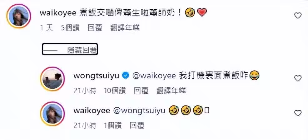 有網民指黃翠如大肚不應該煮飯,她就笑指:「我遊戲裡面煮飯。」並表示老公會無限容忍:「我那個拍檔他說他要忍著啊。」