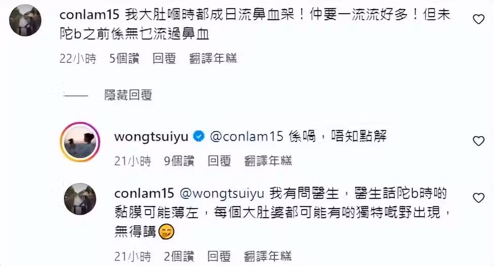 黃翠如表示剛流鼻血,不少媽媽紛紛留言:「我大肚那時也總是流鼻血!一流流好多!但沒懷孕之前是沒怎麼流過鼻血。」獲得黃翠如回覆:「是啊,不知道為什麼。」另有媽媽表示:「我大肚時也流鼻血,醫生說正常,因為激素讓血管擴張充血,不用怕。」