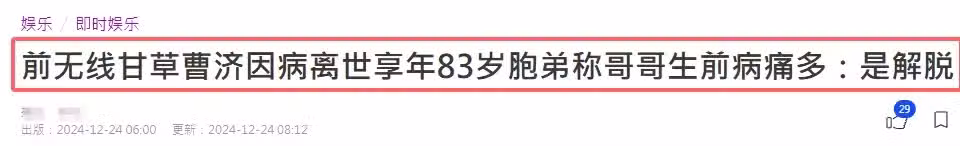 12月24號一早,港媒傳出悲痛消息,前TVB老戲骨曹濟不幸因病去世,享年83歲。對於他來說,也許這樣的結果是最好的,因為他不會再為此遭受病痛的折磨,而曹濟的弟弟也感慨留言:是解脫。