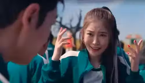 而網友說的馬尾正妹,就是在第一關遊戲前讓T.O.P飾演的饒舌歌手「薩諾斯」一見鍾情的正妹,是編號196號的姜敏兒,薩諾斯在遊戲開始之前,還對姜敏兒唱了一段自創的Rap,但她卻不太理會,直到遊戲「123木頭人」開始之後,李政宰飾演的(成奇勳)出面千叮嚀萬交代大家,在玩偶轉身時不要亂動,以免被射殺淘汰。