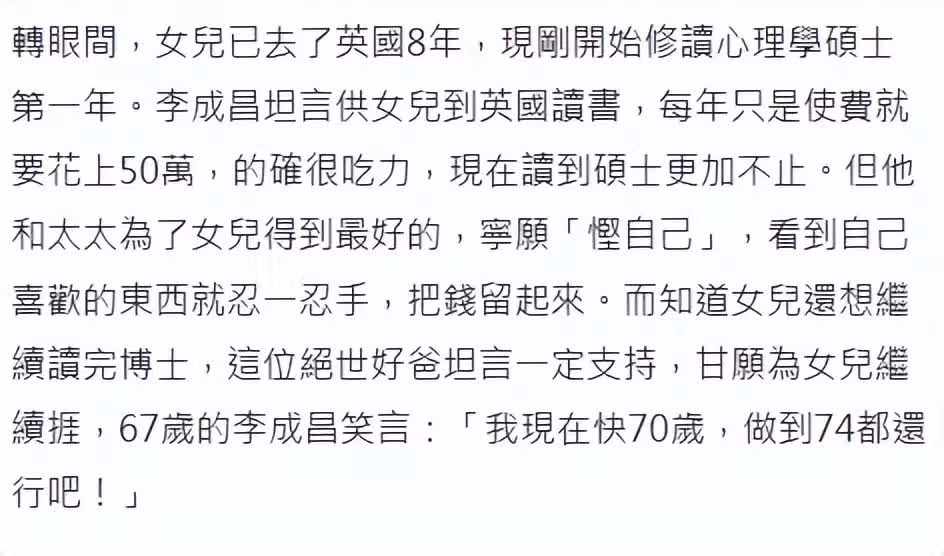 23歲的女兒是碩士第一年,後續還要花上百萬,這也是李成昌不敢退休的原因,坦言現在快70了,做到74也都還行吧。