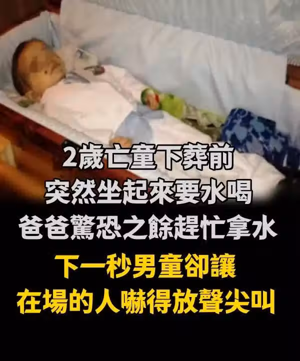 家屬將男童的屍體放在棺材裡整整一夜。 然而隔天葬禮舉行前1小時,男童居然從棺材中坐起來說:〝爸爸,我能喝點水嗎?〞