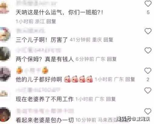 不少網友紛紛留言:「天吶這是什麼運氣,你們一班船?三個兒子啊,厲害了!兩個保姆?真是有錢人。他的兒子都好帥啊。現在老婆養了不用工作。看起來老婆是包辦一切。」