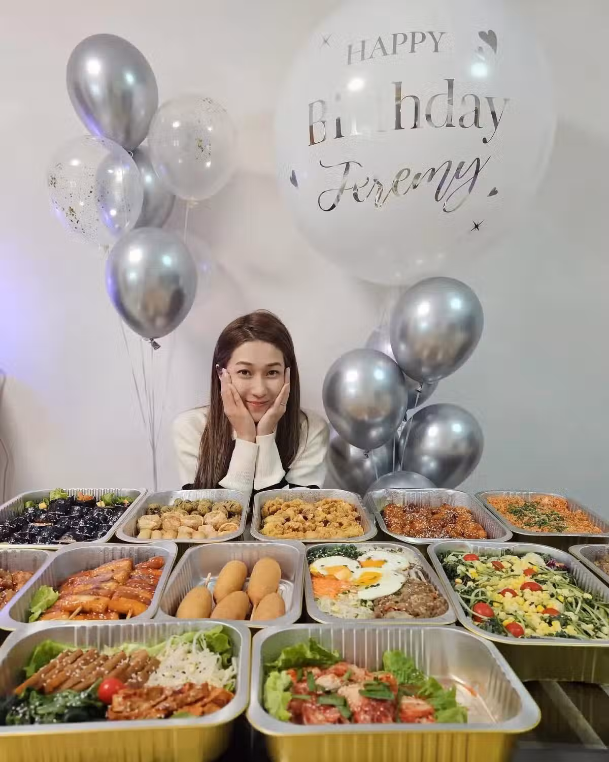 除了生日蛋糕,還有滿桌的美食,鍾嘉欣跟美食一起合影,托臉出鏡模樣太可愛了。不知這些美食是不是鍾嘉欣自己親自做的呢。