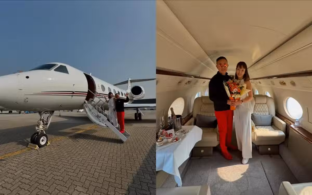 祈文傑的新婚妻外表年輕,貌似TVB女星張曦雯,挑選的婚紗款式以露肩為主,V領設計只輕露事業線,走優雅氣質路線。祈文傑與新娘子非常合襯,二人登上私人飛機去度蜜月,行程以出海、游水、打高爾夫球為主,展現享受生活一面。