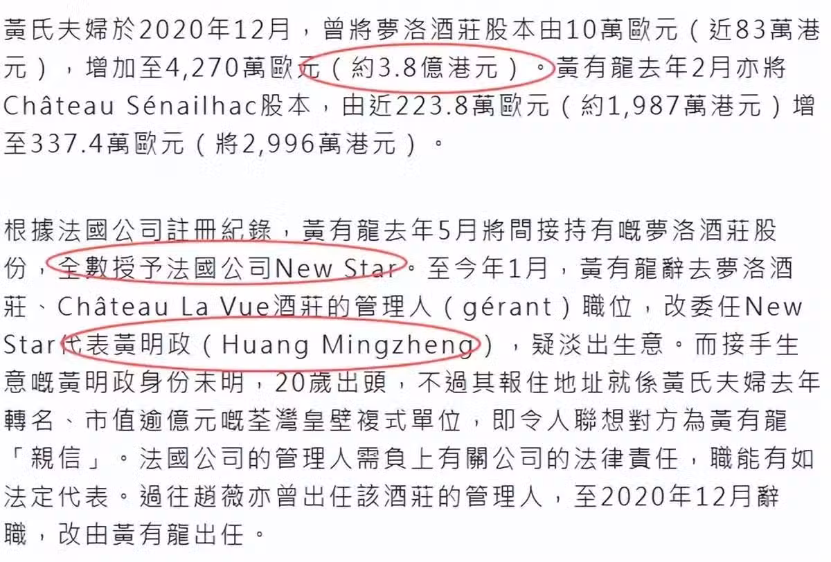 到了2022年,港媒爆料黃有龍和趙薇把名下的4個酒莊轉給黃明政,酒莊共計4億港幣,摺合新台幣17億,黃明政的年齡與黃有龍兒子一樣,讓人懷疑兩人婚姻當時已經破裂。