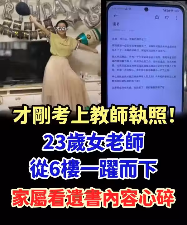 一名20多歲小學女老師就疑似承受不住壓力,留了遺書後一躍而下,遺書內容句句都令人心碎……