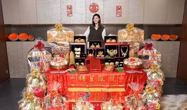 從網上曝光的照片可以看到,這次衛詩雅和未婚夫的過大禮儀式相當搶鏡,各種禮物堆滿了整個桌子。