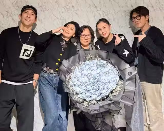 衛斯理先是曬出與姐姐姐夫還有妻子母親拍攝的合照。照片中,身為壽星的賈媽媽站在C位,手捧大束鮮花笑得合不攏嘴。女兒賈靜雯還有兒媳朱芯儀分別站在她兩側比心,不知道的還以為是母女三人。