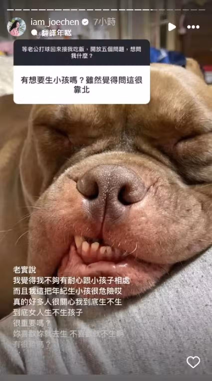 面對外界的催生壓力,陳喬恩在社交媒體上直言:「你喜歡你就去生,不喜歡就不生啊!有很難嗎?」