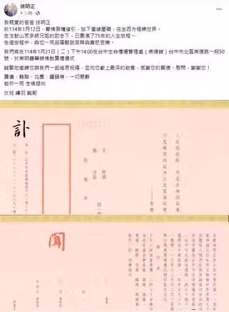 值得一提的是,徐明正生前始終堅持理念,他曾在社群平台表明立場:「50年的民主鬥士不是為任何黨派,而是為了台灣的民主,讓主權真正歸屬人民。」、「台灣人民拒絕打打鬧鬧的民主」、「民主就是選舉輸得起,輸不起,那就無法東山再起」,顯示即使在生命最後階段,仍心繫台灣民主發展。