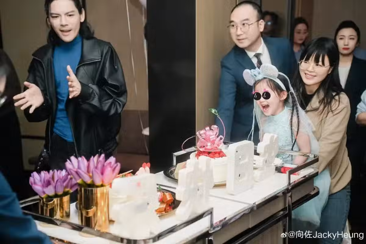 向佐身穿黑色皮衣,酷范十足。向芷穿著藍色裙子,像個小公主一樣甜美可愛。一家人開心合影,幸福滿滿,要是孫子向笙也在,就更圓滿啦。