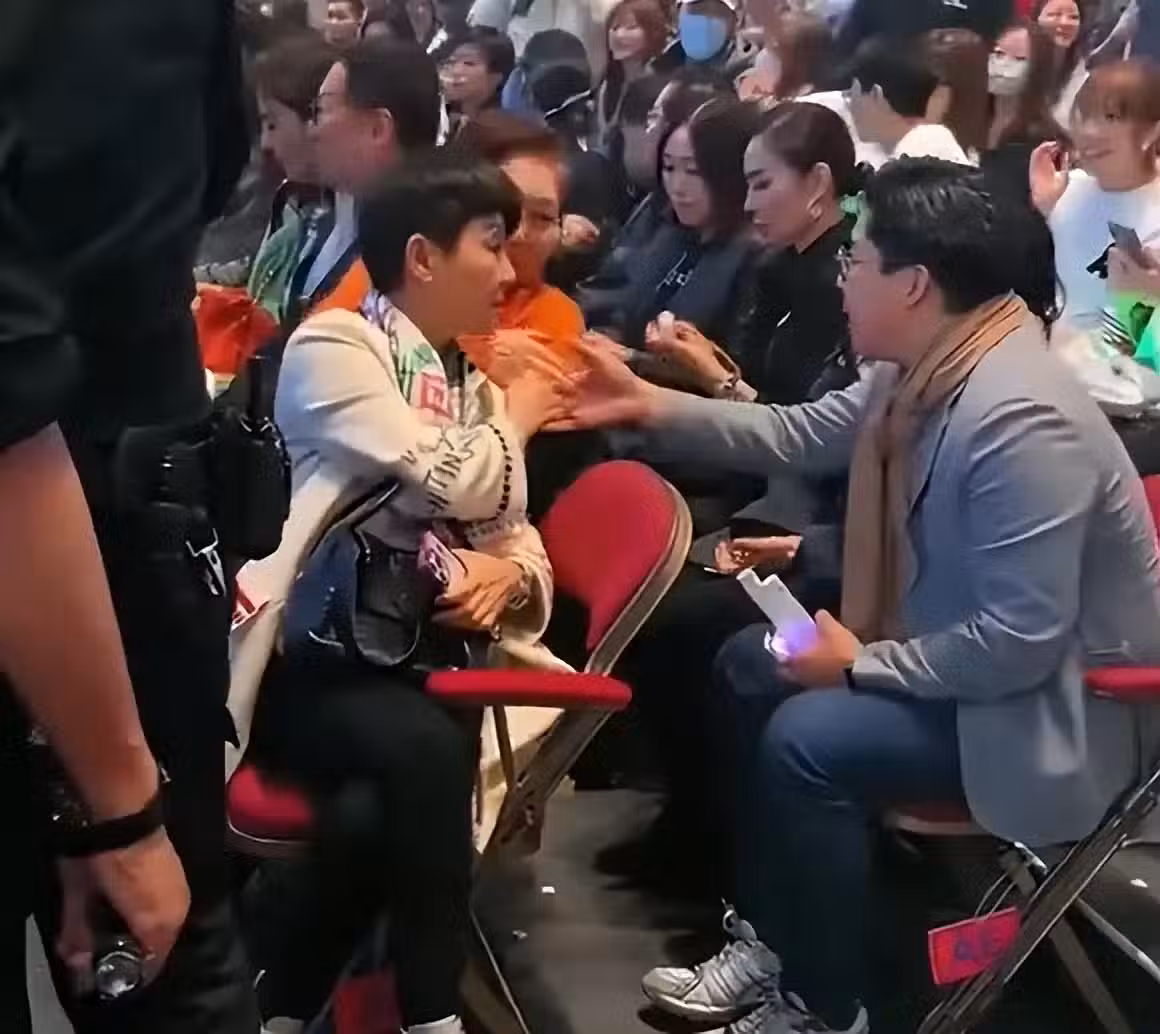 進入內場後,霍啟剛夫婦坐在了第二排,剛好和坐第一排的四太梁安琪挨得十分近。梁安琪一看是小輩霍啟剛夫婦來了,立馬轉身和兩人熱聊起來。