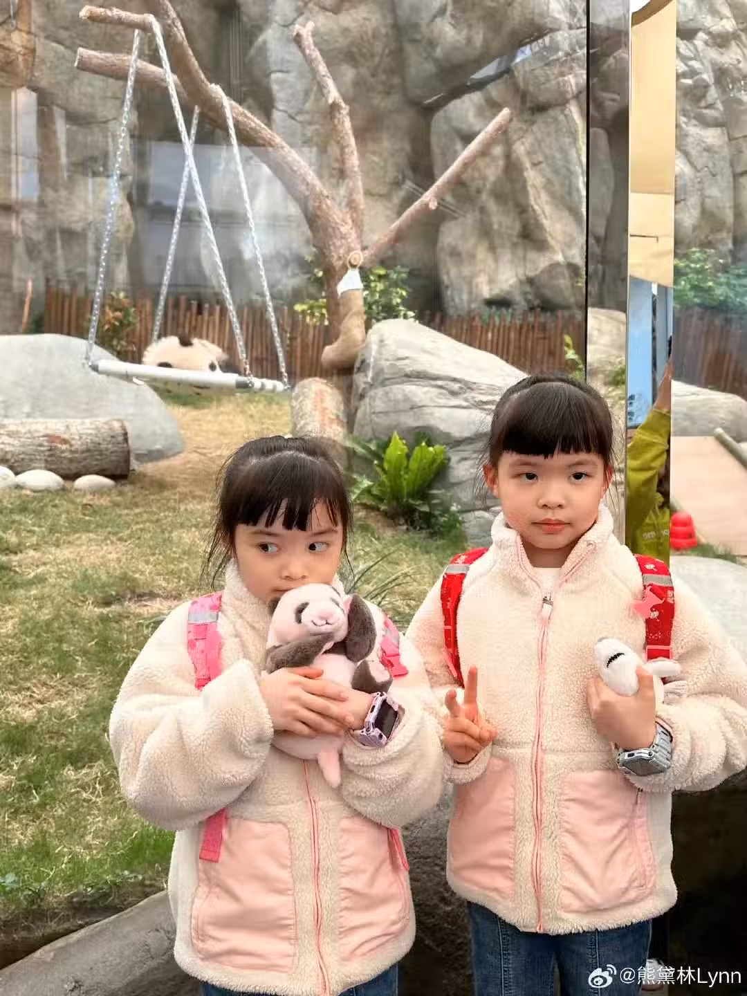 熊黛林夫婦攜女看熊貓,6歲雙胞胎女兒好可愛,妹妹比姐姐高半頭