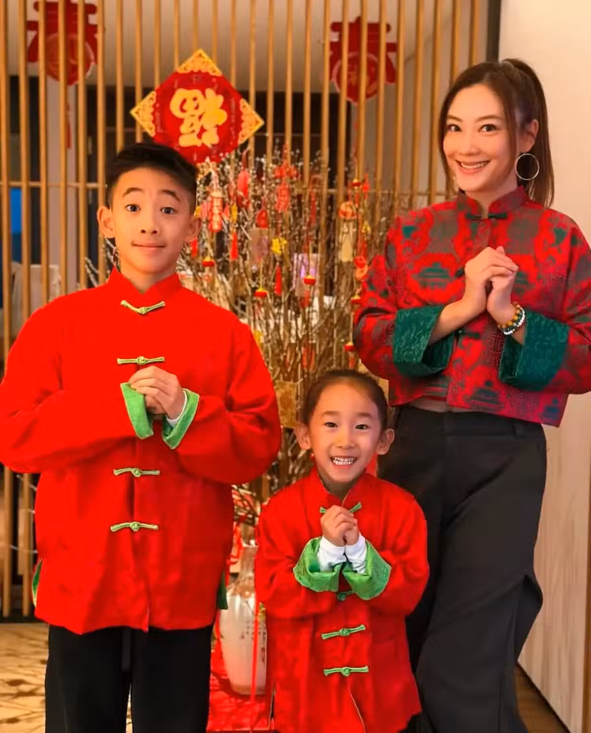 照片中,應采兒扎著高馬尾身穿紅色拜年服和黑色長褲,一身打扮不僅有節日氛圍,還不失時尚感,真的很漂亮。大兒子Jasper和小兒子HoHo穿著同款紅色唐裝,兄弟造型好有愛。一家三口對鏡作揖給大家拜年,溫馨滿滿。