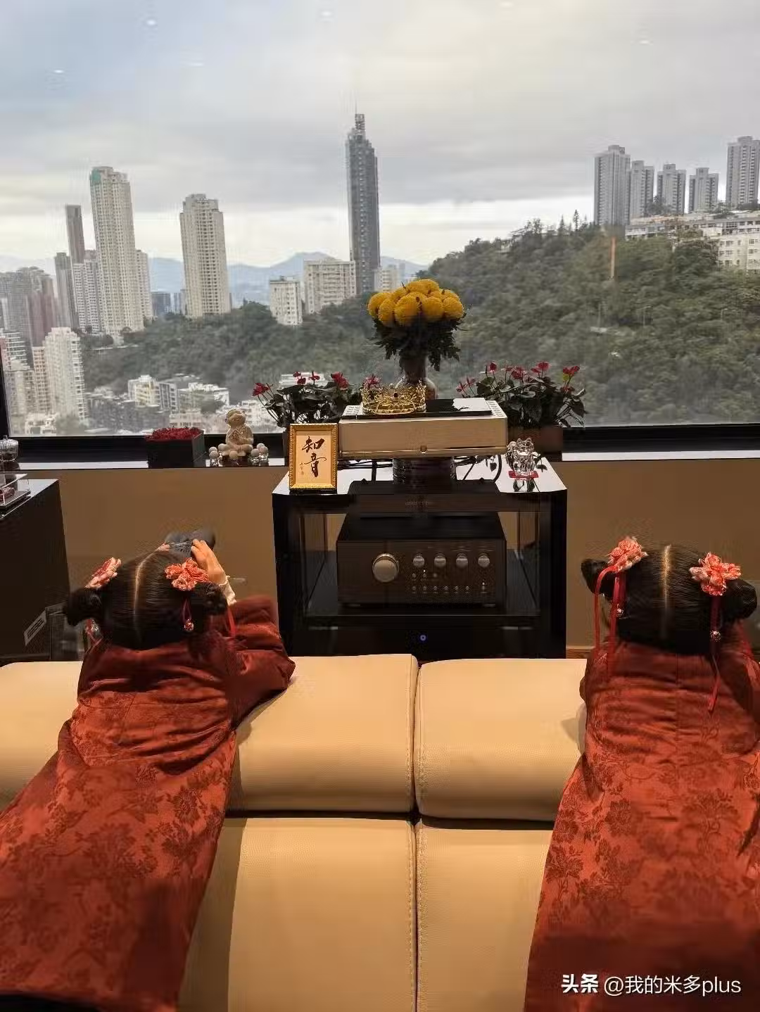 方媛還給女兒準備了一整套拜年服,頭上夾著大紅色條帶蝴蝶結,身上穿著中式印花連衣裙,姐妹倆趴在沙發上看風景,妥妥的兩個小福娃,已經分不清是誰了,像一對雙胞胎,孩子們被方媛養得太招人稀罕了。