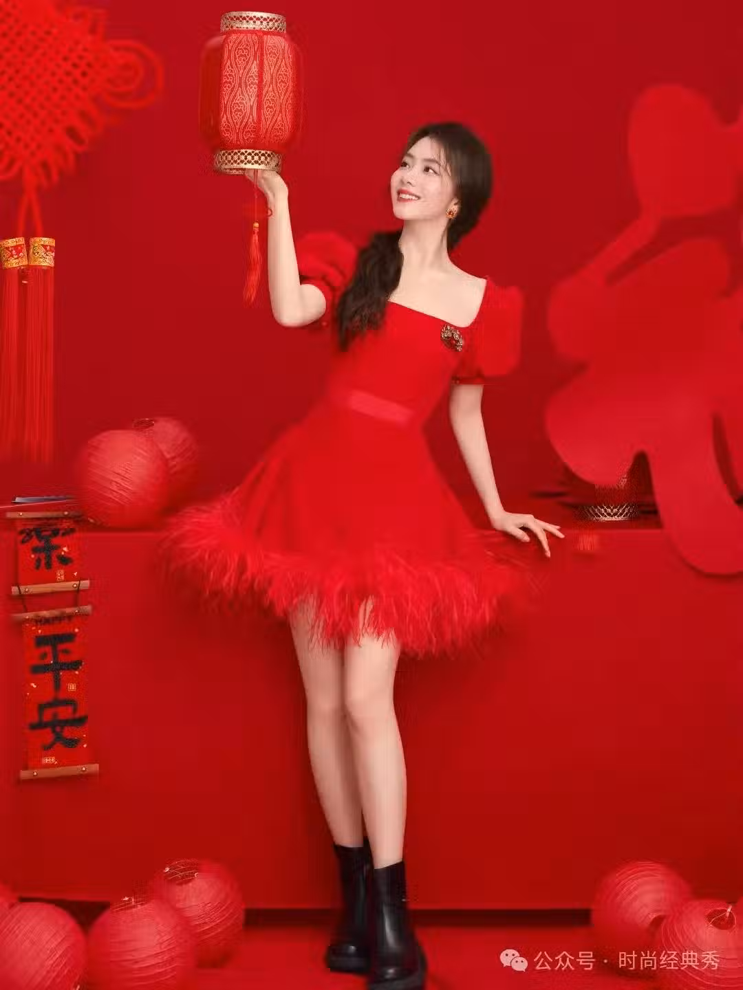 背景布置同樣極具巧思,大紅色調為主,搭配傳統的中國結、紅燈籠以及「福」字、春聯等元素,洋溢著濃郁的節日氣息。譚松韻或手持精緻的紅燈籠,或輕握寫有「喜樂」「平安」字樣的捲軸,每一個動作都自然而親切,仿佛在向人們傳遞著新春的美好祝福。她與這些傳統元素相互映襯,既展現了時尚的力量,又不失傳統文化的韻味。