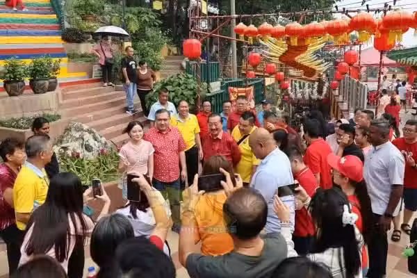 到蜈蚣山天師宮遊玩的遊客紛紛拿起手機與陸兆福及陳志遠伉儷合照。