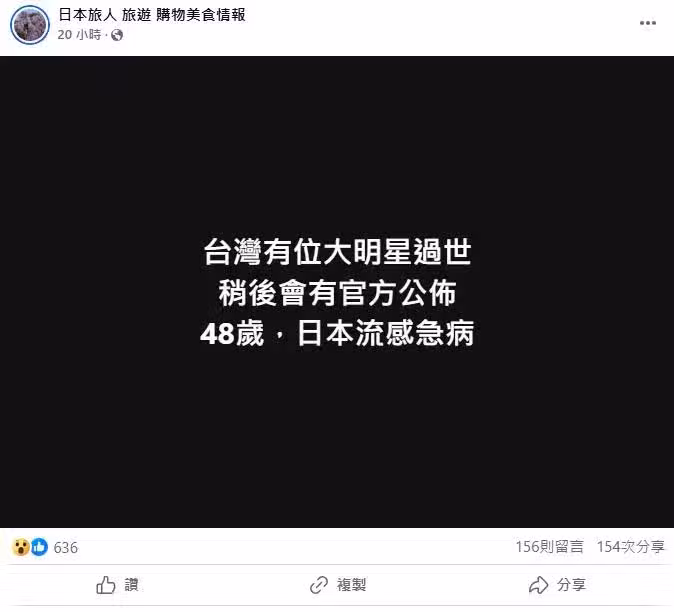 昨(2)日,臉書粉專「日本旅人 旅遊 購物美食情報」發文稱「台灣有位大明星過世,稍後會有官方公布,48歲,日本流感急病。