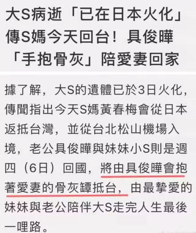 據台媒報道,大S已在日本完成火化儀式,其骨灰將由老公具俊曄和妹妹小S帶回台灣!